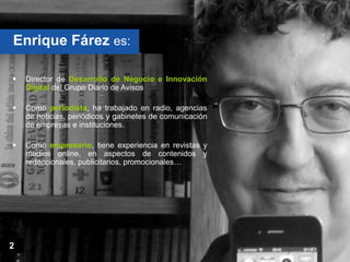 El documento presenta un programa de apoyo al emprendedor ofrecido por Enrique Fárez, director de Desarrollo de Negocio e Innovación Digital del Grupo Diario de Avisos. El programa ofrece durante el primer año de vida de la empresa: noticias sobre la startup, espacio de promoción y publicación, 30 minutos de consultoría gratuita cada mes, publicidad digital valorada en 250 euros al mes, encuestas online gratuitas y participación en iniciativas de regionalización e internacionalización.
