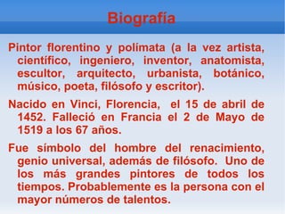 Leonardo da Vinci fue un polímata del Renacimiento italiano conocido principalmente por ser uno de los pintores más grandes de todos los tiempos. Pasó su juventud en Florencia donde estudió en el taller de Verrocchio y comenzó su carrera como pintor. Más tarde trabajó en Milán, Venecia, Florencia y Roma como pintor, ingeniero, científico y arquitecto, realizando obras maestras como La Última Cena y La Gioconda. Terminó su vida en Francia al servicio del rey Francisco I en el cast