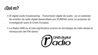 El documento describe el DAB (Digital Audio Broadcasting), un estándar de radio digital desarrollado en Europa. Explica que el DAB ofrece mejor calidad de sonido, mayor cobertura y más información adicional para los oyentes. Para las emisoras, el DAB permite configurar redes de frecuencia única y ser más flexibles con su programación. También describe los diferentes tipos de receptores DAB y la situación de la radio digital en varios países europeos como Dinamarca.