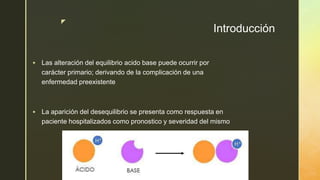 Este documento presenta información sobre el equilibrio ácido-base. Explica conceptos clave como pH, acidemia, alcalemia, ácidos fuertes y débiles. Describe los mecanismos de compensación respiratoria y renal, y ecuaciones como la de Henderson-Hasselbach. Además, incluye valores de referencia de gasometría arterial y métodos como el de Romanski para interpretarlos. Finalmente, analiza conceptos como brecha aniónica y sus aplicaciones en el diagnóstico de alteraciones metabólicas.