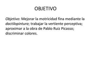 El documento describe una actividad de dactilopintura para niños de 4 años con el objetivo de mejorar su motricidad fina, percepción y discriminación de colores, así como acercarlos a la obra del pintor Pablo Ruiz Picasso. La actividad consiste en esparcir dactilopintura sobre una hoja de papel usando las manos para crear formas a su gusto combinando diferentes colores.