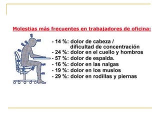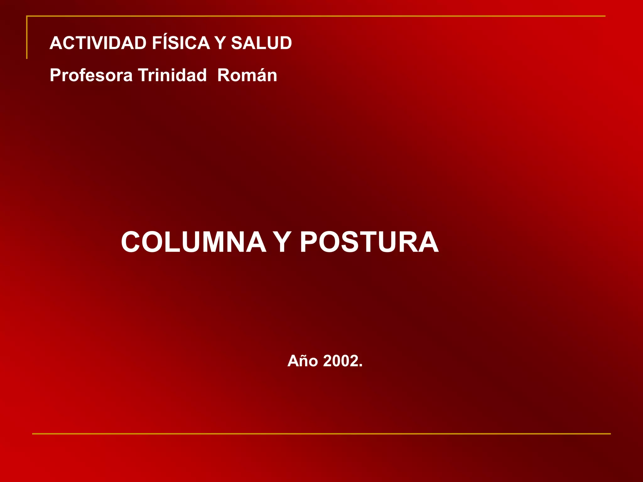 La columna vertebral no es rígida sino que tiene curvaturas que permiten distribuir la presión del cuerpo. Una buena postura mantiene estas curvaturas de forma saludable y previene problemas como la cifosis y la lordosis. Se recomienda realizar ejercicios para fortalecer los músculos de la espalda, mantener una buena alimentación y posturas correctas al sentarse, pararse, levantar objetos y dormir para promover la salud de la columna.