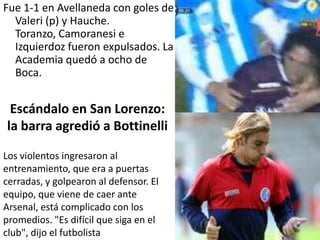 El documento resume varias noticias de Argentina, incluyendo un empate en un partido de fútbol entre Racing y Lanús con tres expulsiones, el derrumbe del techo de una casa sin heridos, la condena perpetua para un oficial naval por crímenes de la dictadura, y una disputa sobre los derechos del nombre de la banda musical "Los Wachiturros".