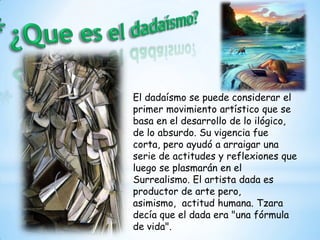El Dadaísmo fue un movimiento artístico y cultural vanguardista que surgió en Suiza luego de la Primera Guerra Mundial, liderado por figuras como Hugo Ball y Tristan Tzara. Se caracterizó por cuestionar y burlarse de las convenciones establecidas a través de medios absurdos, irónicos y provocativos, promoviendo la espontaneidad, la libertad individual y el cambio. Aunque su vigencia fue corta, ayudó a sentar las bases del posterior Surrealismo y a cuestionar nociones sobre el arte, la