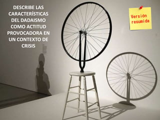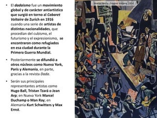 El movimiento dadaísta surgió en 1916 en Zúrich como reacción contra la Primera Guerra Mundial y la sociedad burguesa. Artistas de diferentes nacionalidades se reunieron en el Cabaret Voltaire y rechazaron valores racionalistas, adoptando una posición nihilista y burlándose de convenciones sociales y artísticas. Más que una estética, Dada fue una actitud de rebeldía que cuestionó todo a través de la provocación, el absurdo y el azar, influyendo enormemente en el arte posterior.