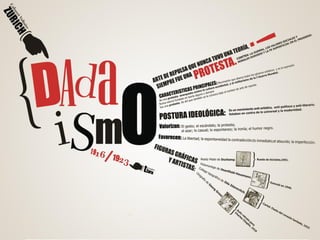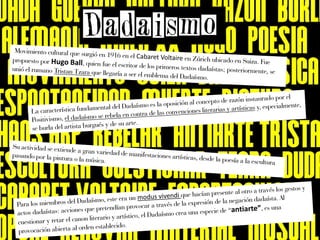 El documento presenta un resumen del movimiento artístico y literario dadaísta. Se fundó en 1916 en Zúrich por Hugo Ball, Tristan Tzara y otros artistas, como una respuesta al nihilismo y racionalismo de la Primera Guerra Mundial. Promovía el absurdo, lo no-sensical y la destrucción estética de convenciones artísticas burguesas. Tzara y otros publicaron manifiestos dadaístas y organizaron eventos escandalosos para "escandalizar a la burguesía". El dadaísmo influ