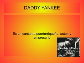 Daddy Yankee es un cantante puertorriqueño que ayudó a popularizar el reggaetón en América Latina y España con su exitoso álbum Barrio Fino. Fue protagonista de la película Talento de Barrio en 2005 y se ha convertido en uno de los artistas latinos más famosos a nivel mundial. Su nombre artístico Daddy Yankee significa "papá grande" y se refiere a su estatura y fuerza dentro de la industria musical.