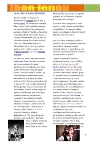 Este documento proporciona una biografía detallada de John Lennon. Resume su vida y carrera como músico, desde su nacimiento en Liverpool y su infancia viviendo con su tía, hasta la formación de The Beatles y su éxito masivo como parte de la banda. Luego de la separación de The Beatles a finales de los 60, Lennon tuvo una exitosa carrera como solista marcada por su activismo pacifista junto a Yoko Ono, hasta su asesinato en 1980.