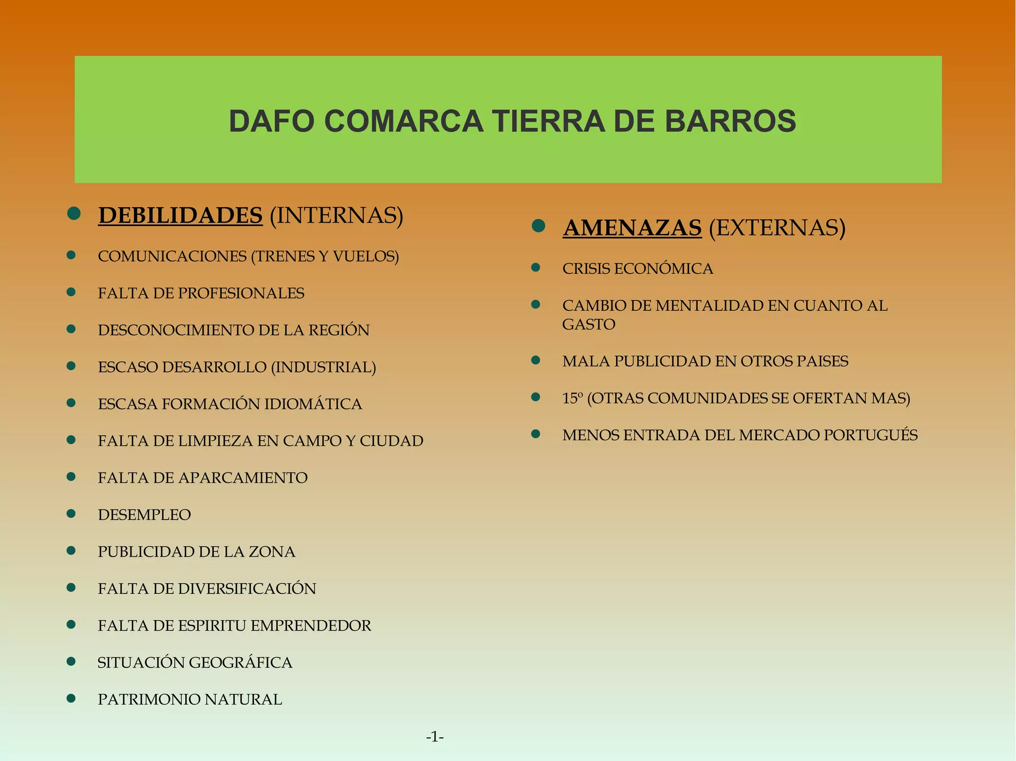 El documento presenta un análisis DAFO de la comarca española de Tierra de Barros. Identifica debilidades internas como las comunicaciones deficientes, falta de profesionales y formación, y desempleo. También señala amenazas externas como la crisis económica, mala publicidad en otros países, y menos entrada del mercado portugués. Las fortalezas internas incluyen la gastronomía, clima, patrimonio histórico y situación geográfica. Por otro lado, las oportunidades externas son el fin de la crisis en otros