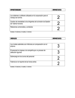 El documento presenta un análisis DAFO de una organización, identificando sus fortalezas como contar con personal capacitado y experiencia certificada y convenios con universidades, sus debilidades como la falta de una política de crecimiento interno y comunicación entre departamentos, sus oportunidades como mejorar los sistemas de nómina y contactos comerciales, y sus amenazas como los bajos salarios en comparación al entorno y sobrecarga laboral del personal.