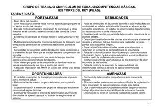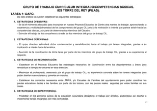 Este documento presenta un análisis DAFO y estrategias para implementar un currículo integrado centrado en competencias básicas en el IES Torre del Rey. Identifica fortalezas como la motivación del profesorado y oportunidades como la normativa actual, así como debilidades como la falta de continuidad del profesorado y amenazas como la resistencia al cambio. Propone estrategias ofensivas, defensivas, de reorientación y supervivencia, con acciones e indicadores de éxito como la capacitación del profesorado y la elabor