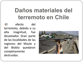 El terremoto de Chile de 2010 tuvo efectos devastadores, destruyendo gran parte de las localidades de las regiones de Maule y Biobío. Fuentes oficiales cifraron el número de viviendas destruidas en medio millón y las dañadas en al menos un millón y medio. Aproximadamente el 80% de la población chilena sintió con fuerza el sismo, que dejó unos 2 millones de damnificados, más del 10% de la población total de Chile.