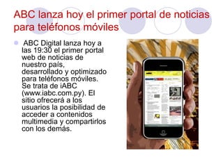 ABC Digital lanzará hoy el primer portal de noticias en Paraguay especialmente diseñado y optimizado para teléfonos móviles, llamado iABC (www.iabc.com.py). El sitio permitirá a los lectores acceder a noticias, fotos y videos directamente desde sus teléfonos, y compartir contenidos con otros. El lanzamiento oficial será hoy a las 19:30 en la Expo de Mariano Roque Alonso.