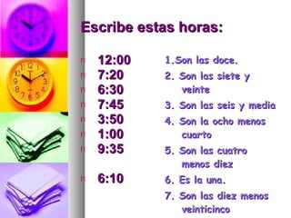 El documento presenta informaciones sobre horarios y rutinas diarias. Incluye expresiones como "son las doce", horarios como "12:00" y "7:20", y objetivos de aprendizaje relacionados con la rutina diaria. También describe las rutinas de varias personas como "me despierto a las seis y media" y "me acuesto a las diez", y preguntas sobre rutinas como "¿a qué hora te levantas?".