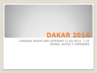 La carrera Dakar 2014 comenzó el 11 de febrero en San Cefarino, con la largada de autos y camiones a las 7:10 horas. Dos helicópteros de la organización estuvieron presentes para supervisar el inicio de la competencia, que incluyó la participación de Hollowzyk en su Mini y de Carlos Saiz con su SMG.