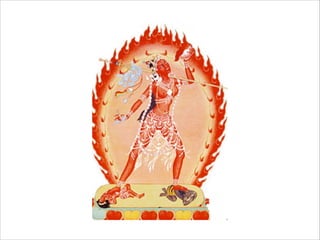 El documento explora la figura de la dakini en el budismo tibetano, representando aspectos femeninos de sabiduría que inspiran prácticas tántricas. Las dakinis, descritas como energías femeninas y manifestaciones de la realidad, juegan un papel crucial en la transformación espiritual de los practicantes. Se destacan sus diversas clasificaciones y su capacidad para enseñanzas directas a través de experiencias, visiones y rituales.