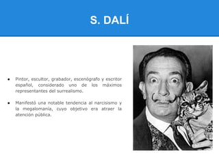 Salvador Dalí fue un pintor español considerado uno de los máximos representantes del surrealismo. Tuvo una infancia difícil que influyó en su obra, la cual se caracterizó por explorar el subconsciente a través de técnicas como el método paranoico-crítico. Dalí vivió entre España y Estados Unidos y produjo obras emblemáticas del surrealismo como La persistencia de la memoria y Metamorfosis de Narciso.
