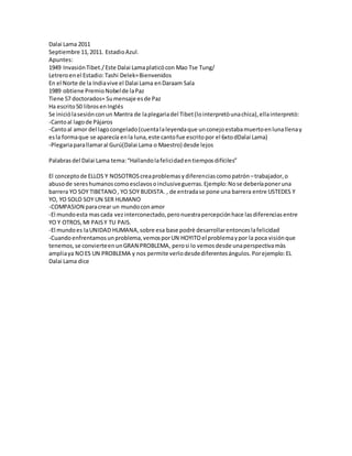 El Dalai Lama habló sobre su experiencia en el Tíbet y su mensaje de paz. Ha escrito 50 libros y recibido 57 doctorados. En su discurso, enfatizó que conceptos como "ellos y nosotros" crean divisiones que conducen a problemas. En cambio, promovió la compasión y la visión de la humanidad como una unidad. Explicó que al ver los problemas desde una perspectiva más amplia en lugar de enfocarse en pequeños detalles, éstos dejan de ser problemas.