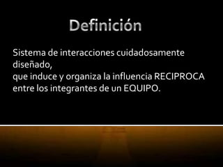 Este documento describe un sistema de interacciones diseñado para promover la influencia recíproca y el desarrollo del pensamiento entre los miembros de un equipo mediante la colaboración, el establecimiento de normas grupales y la disminución del temor a la crítica, lo que aumenta la motivación y permite conocer nuevos temas e información.