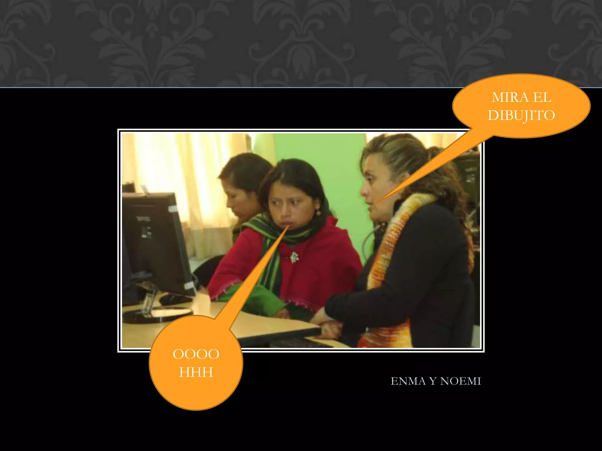 El documento presenta una serie de fotos y comentarios de varias personas. Enma y Noemi toman una foto juntas con whisky. Alicia y Diana se hacen las que trabajan para no mirar a la cámara. Karina y Sol le dicen a otra persona que no mire a la cámara y que se haga la que trabaja. Noemi posa para una fotografía. Dalila Cushqui disimula frente a la cámara.