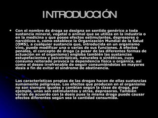 El documento proporciona información sobre varias drogas, incluyendo su definición, formas de consumo, efectos y riesgos. Explica que la cocaína es una droga estimulante y adictiva que se puede inhalar, inyectar o fumar. La heroína normalmente se encuentra en polvo blanco o marrón y también se puede fumar, inyectar o inhalar. La marihuana se consume principalmente en cigarrillos llamados porros, y puede causar alteraciones psicológicas y problemas respiratorios.