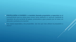 La propulsión a reacción es un procedimiento que utiliza la expulsión de gases a alta presión producidos por un motor para impulsar un vehículo hacia adelante mediante la tercera ley de Newton. Se utiliza principalmente en naves espaciales y proyectiles, donde la expulsión de parte de la masa de la nave crea una fuerza opuesta que la impulsa. Un ejemplo sencillo es la propulsión de un globo cuando se suelta el aire en su interior.