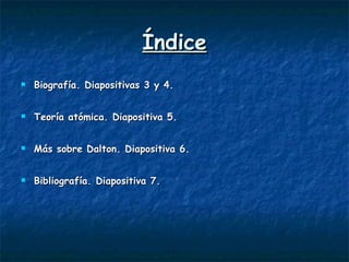 Este documento resume la biografía y teoría atómica del químico inglés John Dalton. Explica que Dalton propuso en 1808 que los elementos están compuestos de átomos indivisibles y que los átomos de un mismo elemento son iguales pero diferentes de los de otros elementos, sentando así las bases de la teoría atómica moderna. También desarrolló uno de los primeros sistemas de símbolos químicos y publicó una tabla de pesos atómicos de elementos.