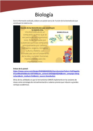 Este documento presenta un proyecto educativo realizado por un estudiante de 1er año de bachillerato en la institución educativa fiscal "Miguel de Santiago". El proyecto utilizó la herramienta Canva para crear diferentes recursos digitales como mapas conceptuales, líneas de tiempo, carteles e infografías sobre temas de varias asignaturas, con el objetivo de implementar estrategias de enseñanza y aprendizaje mediante el uso de herramientas tecnológicas.