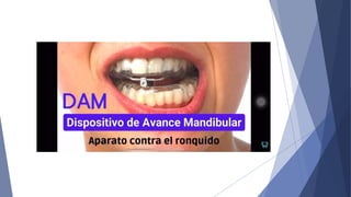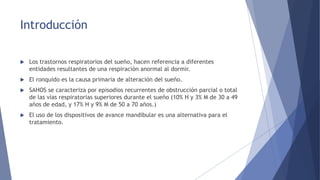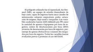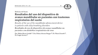 El documento resume los resultados de un estudio que evaluó el uso de dispositivos de avance mandibular (DAM) en pacientes con trastornos respiratorios del sueño. El estudio encontró que el uso de DAM mejoró los parámetros medidos en la poligrafía respiratoria de los pacientes, especialmente para aquellos con síndrome de apnea obstructiva del sueño moderado o leve. No se observaron efectos adversos en los pacientes que usaron el DAM durante el período de seguimiento de hasta 3 meses.