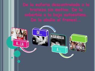 El documento habla sobre la inestabilidad emocional en la adolescencia. Explica que se debe a la explosión de actividad neuronal y la inmadurez emocional típica de esta etapa. Los adolescentes experimentan cambios de humor extremos como euforia, tristeza, baja autoestima, entre otros, debido a los desequilibrios en los neurotransmisores y hormonas. Además, están lidiando con muchos cambios físicos, cognitivos y emocionales al mismo tiempo, lo que puede llevar a comportamientos de rebeldía