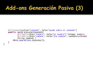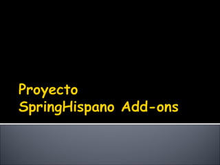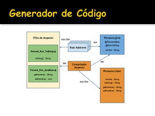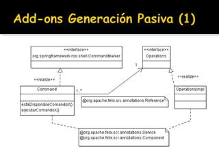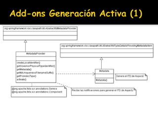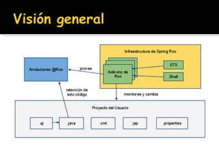 Spring Roo es una herramienta RAD para desarrollo en Java que permite la generación de código y es extensible a través de add-ons. Facilita la programación utilizando frameworks como Spring y JPA, ofreciendo alta productividad y una rápida curva de aprendizaje. Los comandos de Spring Roo permiten gestionar proyectos y add-ons de manera eficiente, optimizando las tareas de desarrollo.