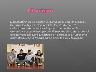 Daniel Martín es un cantante, compositor y actor español conocido por ser el líder y vocalista del grupo musical "El Canto del Loco". Ha lanzado dos discos como solista y ha participado en numerosas películas, obras de teatro y series de televisión. Algunas de sus obras más destacadas incluyen la película "El Canto del Loco: La película" y las series "Los hombres de Paco" y "Cuenta atrás".