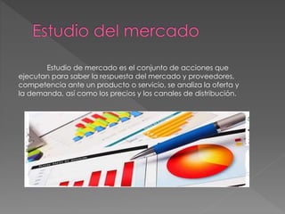 El documento describe varios conceptos clave para realizar un estudio de mercado. Explica que un estudio de mercado analiza la oferta, demanda, precios y canales de distribución de un producto o servicio para conocer la respuesta del mercado. También describe la importancia de crear un producto como parte del estudio de mercado para entender las necesidades de los consumidores y mejorar el producto. Finalmente, explica que el análisis del punto de equilibrio es fundamental para determinar la rentabilidad de un producto.