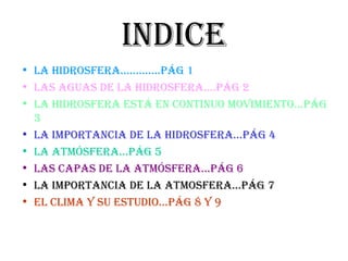 Este documento resume la hidrosfera y la atmósfera. La hidrosfera incluye las aguas oceánicas y continentales. La atmósfera es la capa de aire que rodea la Tierra y contiene nitrógeno, oxígeno y otros gases. El documento también describe la importancia de la hidrosfera y la atmósfera, las capas de la atmósfera, y cómo se estudia el clima.