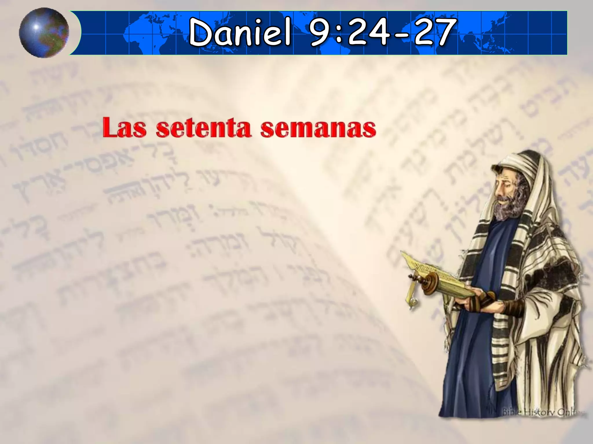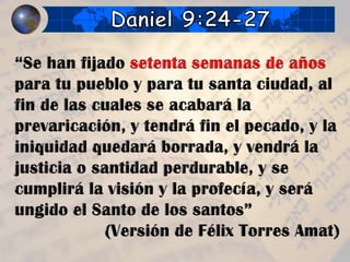 Este documento resume cronológicamente los eventos clave relacionados con la reconstrucción de Jerusalén desde el decreto de Ciro en 537 a.C. hasta el martirio de Esteban en 34 d.C., incluyendo fechas como 457 a.C., 408 a.C., 27 d.C. y 31 d.C. Se mencionan hitos como la reconstrucción de Jerusalén, el bautismo de Jesús, su muerte y el rechazo del evangelio por parte de Israel tras el martirio de Esteban.