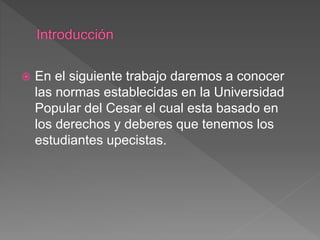 El documento describe el reglamento estudiantil de la Universidad Popular del Cesar. Establece las normas de derechos, deberes, y procedimientos disciplinarios para los estudiantes. Explica que el reglamento contiene artículos sobre admisión, matrícula, titulación, derechos, deberes, sanciones e infracciones. También indica que el reglamento es importante para que los estudiantes y docentes conozcan las normas de convivencia y procedimientos en caso de una infracción.