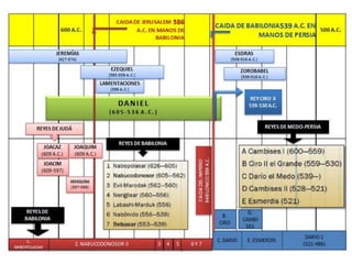 El documento describe los eventos históricos clave que involucran a los reinos de Judá, Babilonia y Persia entre los años 600 a.C. y 500 a.C. Incluye la caída de Jerusalén en manos de Babilonia en 586 a.C., la caída del Imperio Babilonio a manos de los persas en 539 a.C. bajo el mando de Ciro el Grande, y una lista de los reyes de estos tres reinos durante este período.