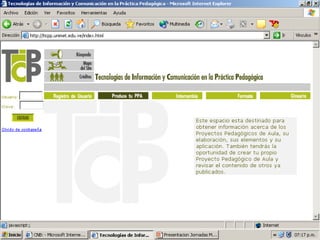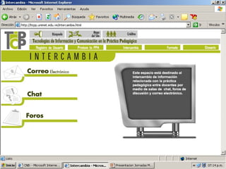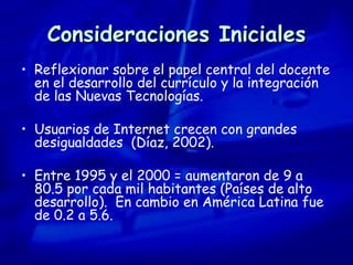 El documento discute la integración de las tecnologías de la información y la comunicación (TIC) en el currículo educativo. Explica que las TIC pueden mejorar el proceso de enseñanza-aprendizaje siempre que se integren adecuadamente en los objetivos, contenidos y estrategias del currículo. También describe algunos proyectos exitosos de integración de las TIC en escuelas de América Latina.