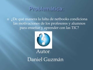 Este documento analiza cómo la falta de netbooks en una escuela condiciona la motivación de profesores y alumnos para enseñar y aprender con TIC. A pesar de no tener netbooks, los alumnos usan computadoras para buscar información y hacer tareas. Los profesores usan creativamente los recursos disponibles como una sala de computación. Aunque las TIC podrían ayudar más si hubiera más acceso, profesores y alumnos se motivan a usar las TIC de todos modos.