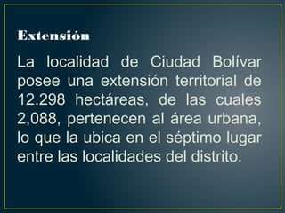 La localidad de Ciudad Bolívar tiene una extensión de 12,298 hectáreas, de las cuales 2,088 son área urbana. Limita con las localidades de Bosa, Soacha y Sumapaz. Su población ha crecido rápidamente, alcanzando 418,609 habitantes en 1993. La mayor parte de su territorio es montañoso y rural.