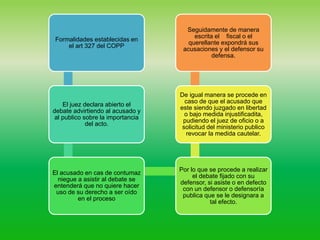 El documento resume los principales aspectos del debate y juicio oral en el Código Orgánico Procesal Penal de Venezuela. Establece que el juez declara abierto el debate y advierte sobre su importancia. Si el acusado no asiste, se entenderá que no desea ser oído y el debate continuará con su defensor. Durante el debate, la fiscalía y querellante exponen sus acusaciones y la defensa presenta su caso. Al concluir, la sentencia se dicta el mismo día o hasta 10 días después.