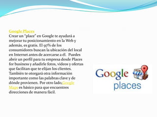 El documento describe varias herramientas gratuitas de Google que pueden ser útiles para negocios, incluyendo Google Places para crear un perfil de negocio, Google Adwords para anuncios pagados, Google Apps for Business que ofrece aplicaciones en la nube, y Google Analytics para análisis de tráfico de sitios web.