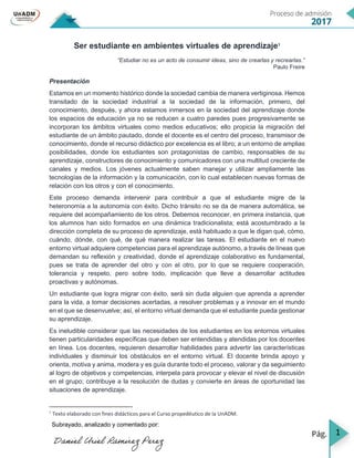 Este documento discute los desafíos de ser un estudiante en entornos de aprendizaje virtuales. Explica que los estudiantes ahora tienen más autonomía y responsabilidad sobre su aprendizaje. También deben desarrollar habilidades como el aprendizaje autónomo, la colaboración, la gestión del tiempo y la comunicación escrita. Los estudiantes en línea enfrentan retos como dejar atrás el aprendizaje pasivo y adoptar una actitud proactiva y crítica. Los docentes deben apoyar a los estud