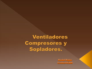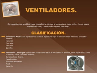 El documento describe sistemas de ventilación y compresión de aire, incluyendo las clasificaciones de ventiladores axiales y centrífugos, así como los compresores de desplazamiento positivo. Se discuten aplicaciones específicas y la importancia de mantener condiciones óptimas para prevenir riesgos de salud en el área de trabajo. Finalmente, se enfatiza la necesidad de dimensionar adecuadamente las redes de distribución de aire comprimido para minimizar la pérdida de presión.