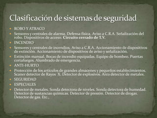 El documento habla sobre diferentes sistemas de seguridad como detección de robos, incendios, hurto y seguridad especial. Describe sensores, alarmas, detección de sustancias y equipos para la extinción de incendios. También cubre sistemas de vigilancia de CCTV para dar seguridad a personas y vigilar espacios, ya sea apoyando a vigilantes o de forma automática. Finalmente, menciona que las cámaras IP permiten transmitir video en red desde cualquier lugar y que las cámaras de seguridad son elementales para hablar de seg