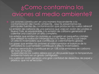 Los aviones contribuyen significativamente a la contaminación ambiental a través de las emisiones de carbono y otros gases de efecto invernadero. Las emisiones de un solo vuelo de Londres a Nueva York son equivalentes a las emisiones de calentar una casa durante un año. El sector aeronáutico representa actualmente el 15% de las emisiones de carbono mundiales. La UE ha propuesto un sistema para controlar y limitar las emisiones de los vuelos dentro de Europa a partir de 2011.