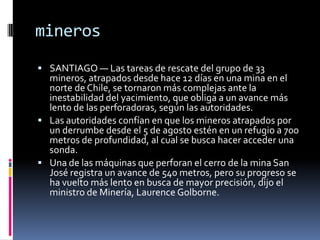 33 mineros quedaron atrapados bajo tierra en una mina en el norte de Chile hace 12 días. Las autoridades confían en que los mineros están refugiados a 700 metros de profundidad. Las máquinas perforadoras avanzan lentamente en su búsqueda para garantizar precisión dado que la mina ha demostrado gran inestabilidad. El presidente reconoció que el rescate es complejo debido a la profundidad y condiciones inseguras de la mina.