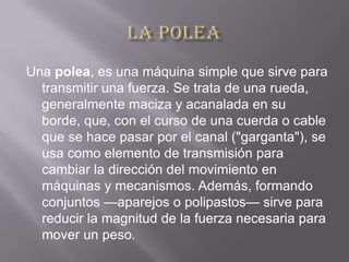 Una polea es una rueda con un canal en su borde por el que pasa una cuerda o cable, permitiendo transmitir y cambiar la dirección de una fuerza de manera más eficiente. Históricamente, Arquímedes demostró que con poleas podía mover cualquier peso aplicando solo una fuerza menor. Las poleas se pueden combinar para reducir aún más la fuerza necesaria para realizar una tarea. Difieren de los engranajes en que estos usan dientes u otros relieves para transmitir fuerza entre ruedas.