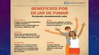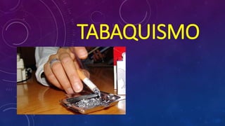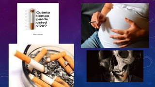 El documento resume los efectos negativos del tabaco en la salud, incluyendo su potencial adictivo debido a la nicotina, y cómo es un factor de riesgo para varias enfermedades como cáncer y problemas cardíacos y respiratorios. También discute cómo el tabaco no solo afecta a los fumadores, sino también a los fumadores pasivos que respiran el humo ambiental, y cómo el tabaquismo es una de las principales causas de mortalidad.