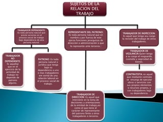 El documento describe los sujetos de la relación laboral, incluyendo trabajadores dependientes e independientes, patronos, representantes, directores, inspectores, vigilantes y contratistas. Luego define el contrato de trabajo como el acuerdo mediante el cual una persona presta servicios bajo dependencia y remuneración. Explica que el contrato debe identificar a las partes, el puesto, servicios, fecha de inicio, jornada, salario y lugar de trabajo. Finalmente, distingue entre contratos por tiempo determinado e indeterminado, y para una obra determinada.